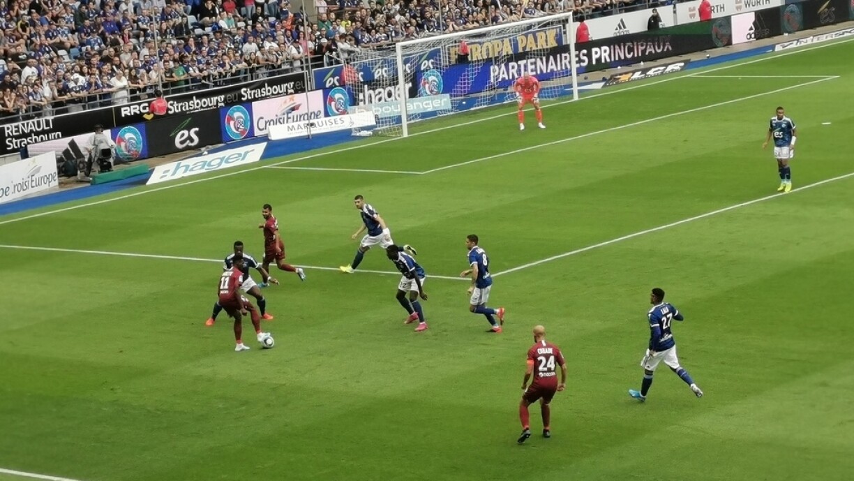 Deux mois après avoir assuré tranquillement leur accession au sein de l’élite, les Messins savaient leur tâche compliquée à Strasbourg, à l’heure de faire leur rentrée en Ligue 1. Dans une Meinau bouillante et sous la pluie, les Grenats sont tombés sur un adversaire coriace qui, lui, a débuté sa saison un peu en avance dans la mesure où il a déjà disputé trois tours préliminaires de Coupe d’Europe (pour le compte de la Ligue Europa). Metz se présentait dans la capitale alsacienne avec deux de ses recrues, N’Doram (prêté par l’AS Monaco) aligné dans l’entre-jeu aux côtés de Cohade, et Centonze (ex-Lens), qui a pris place sur le côté droit de la défense, remplaçant Balliu, lequel a quitté le club grenat cet été.