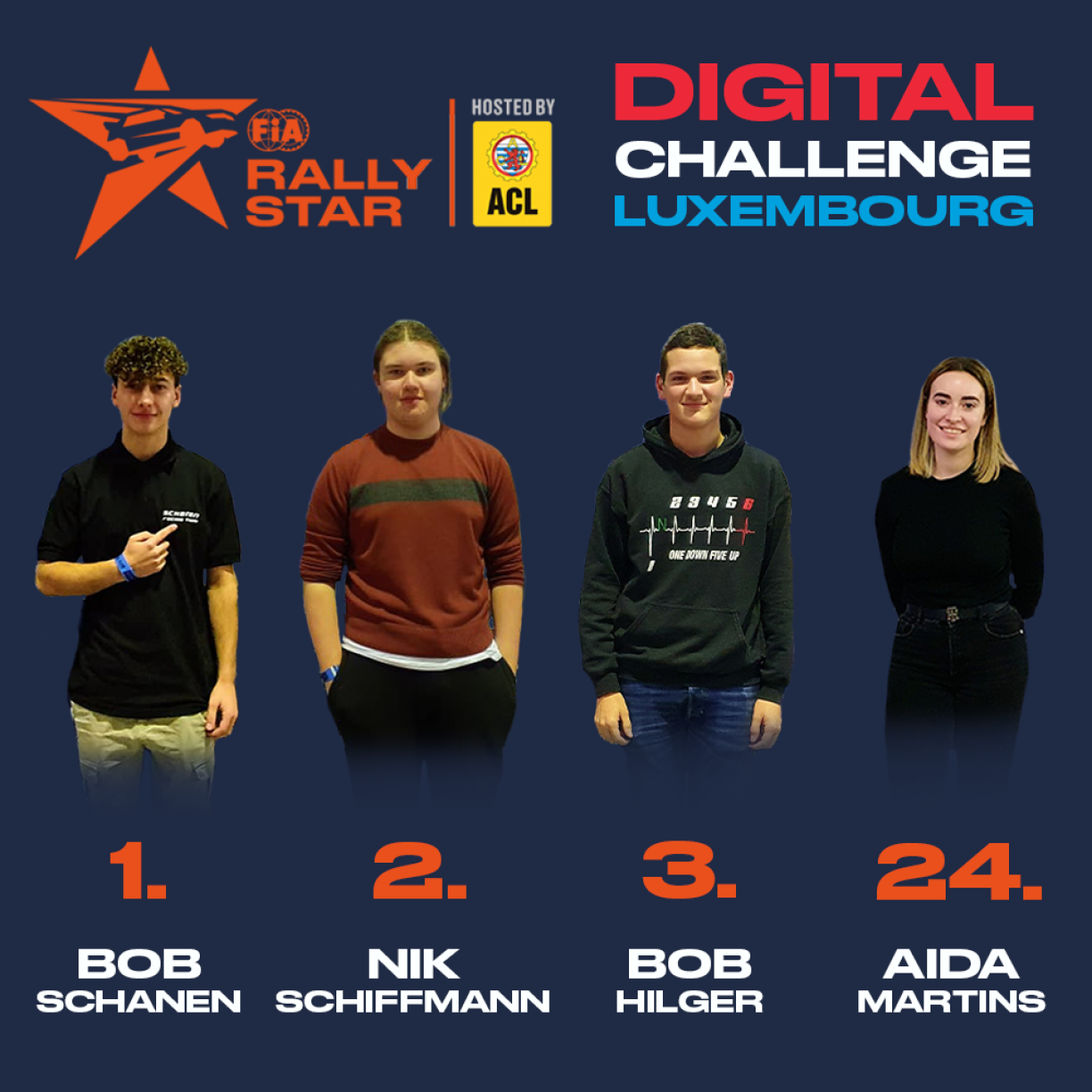 Il s’agit de Bob Shanen (meilleur temps 4:38.389), Nik Schiffmann (4:39.256), Bob Hilger (4:43.460) et Aida Martins, classée 24e du général mais meilleure pilote féminine luxembourgeoise du challenge (6:23.631). Une femme a fait mieux mais elle est allemande: Chantal Linden (5:48.167), qui a tout de même été invitée à participer à la prochaine étape de ce programme qui s’échelonne sur 5 ans. Cette finale continentale aura lieu en janvier prochain, en Allemagne, dans de vrais engins cette fois, des cross-cars.