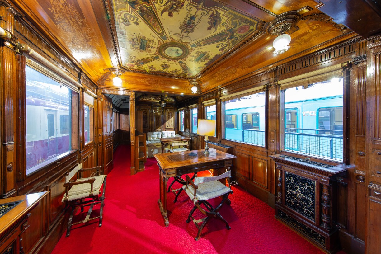 La voiture est principalement aménagée en salle de conférences. Ce monstre de 18 mètres de long, pesant 35 tonnes comporte, outre les appartements privés, un salon d’extrémité avec sa parure et son mobilier d’origine.
