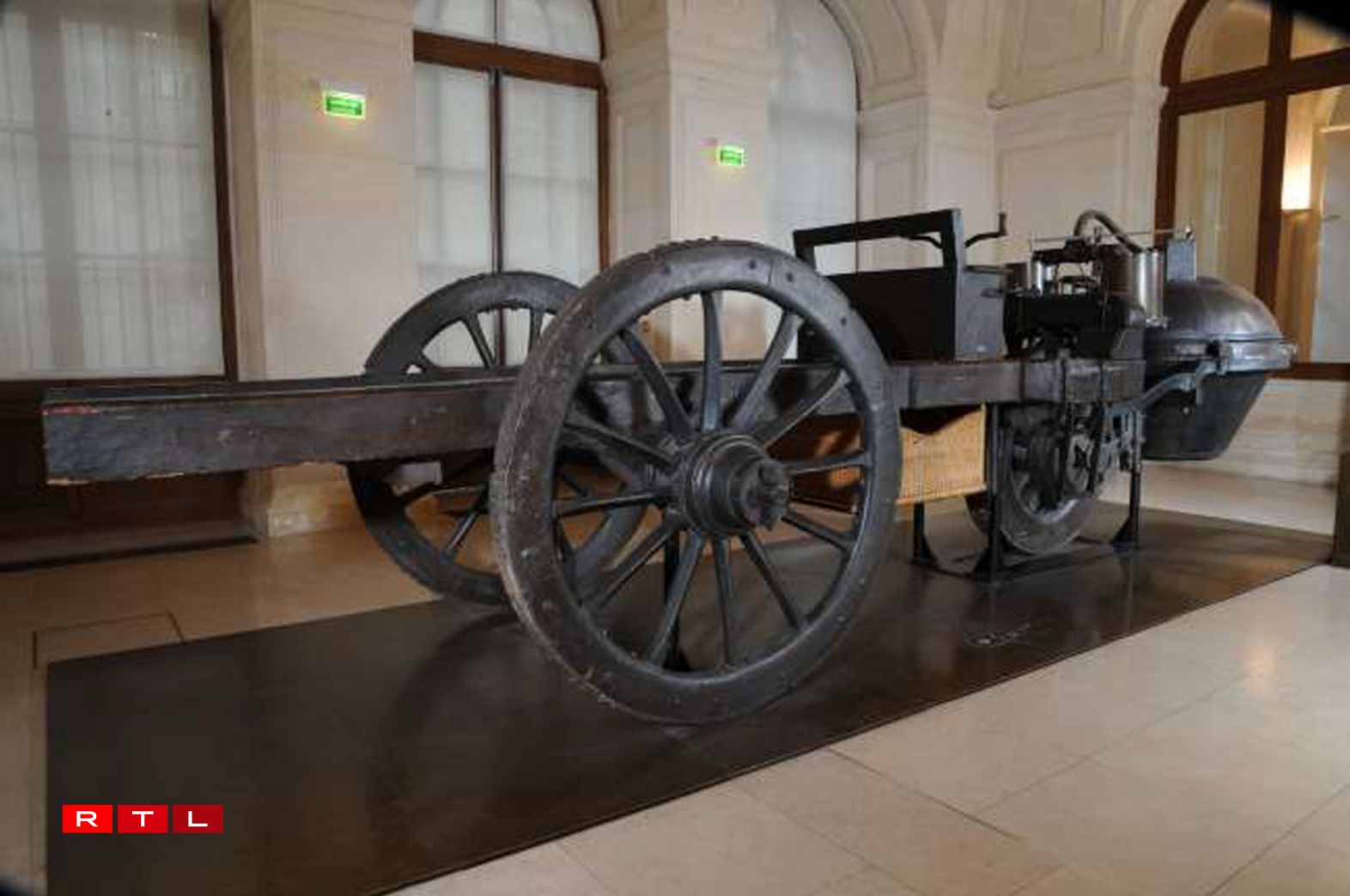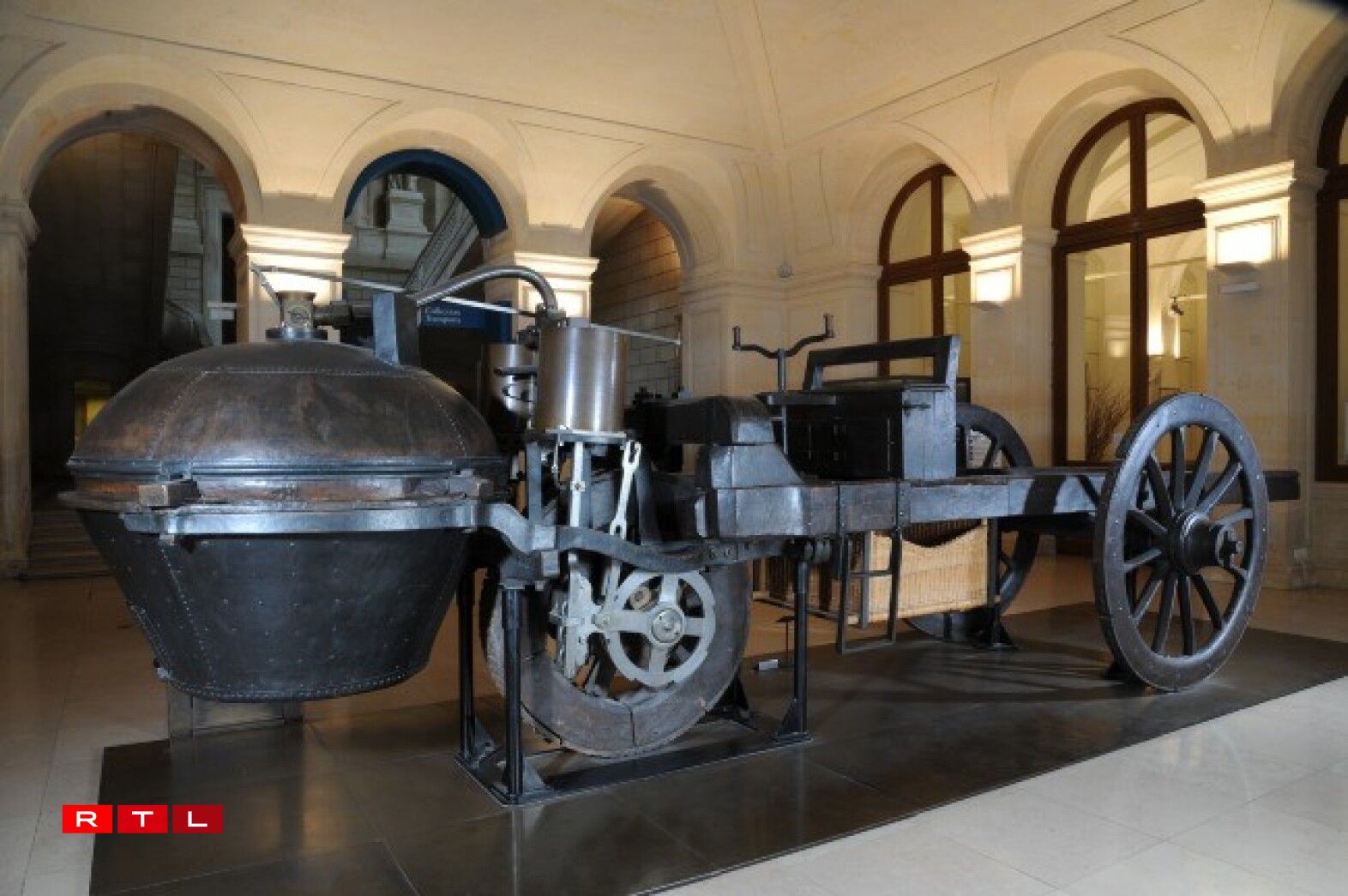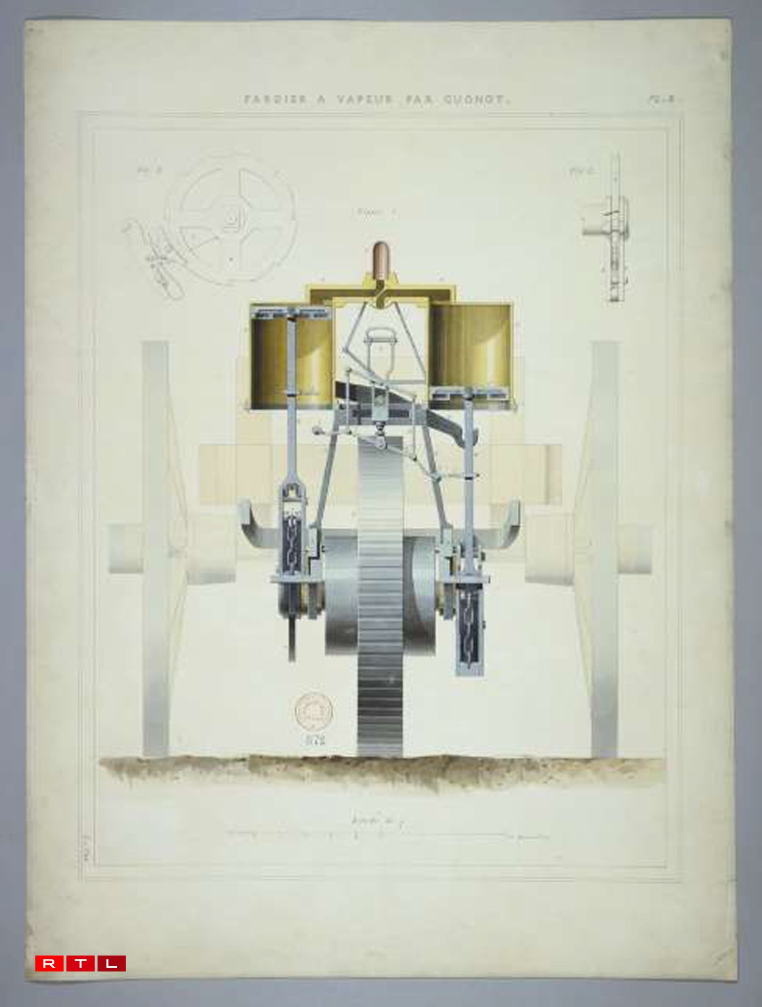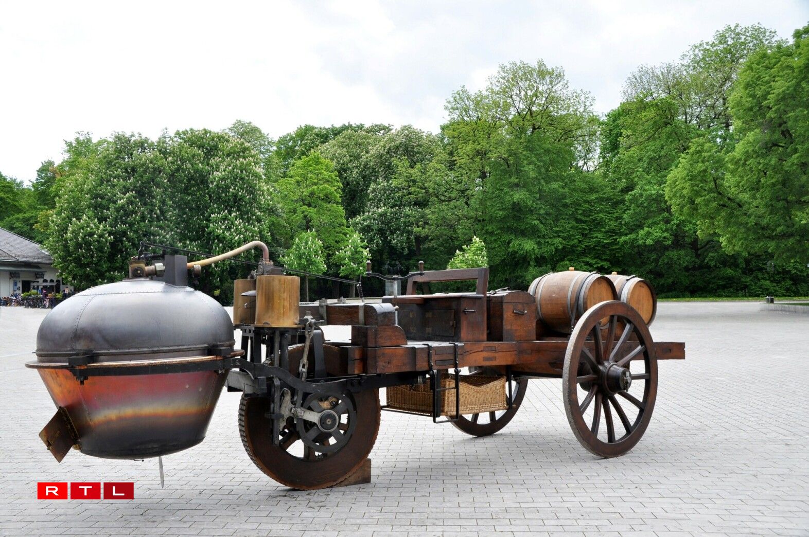La première machine est testée en 1769, il s’agit d’une petite version d’un “fardier à vapeur” à trois roues. Le fardier était à l’époque un énorme chariot tiré par des chevaux et utilisé pour le transport de matériel lourd. Mais au lieu des chevaux Joseph Cugnot y installe un moteur à vapeur.