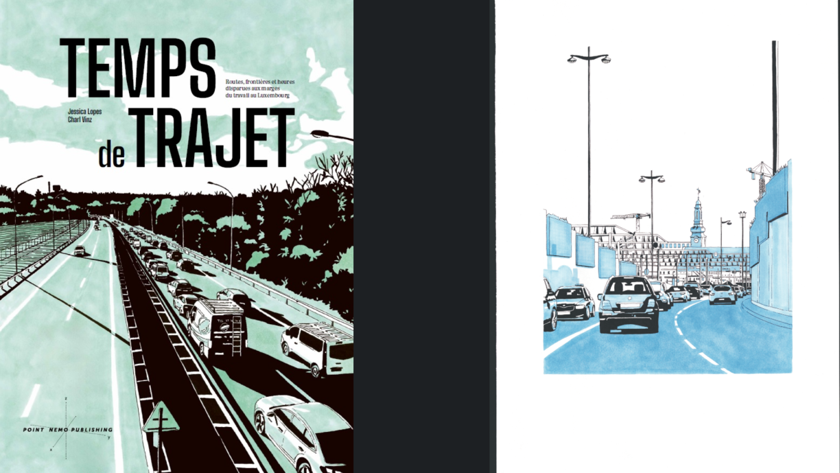 Quel meilleur endroit qu’un bouchon sur une autoroute luxembourgeoise pour évoquer Temps de trajet ? C’est embarqués dans une voiture aux heures de pointe que nous avons réalisé l’interview de la sociologue Jessica Lopes et du dessinateur Charl Vinz, qui ont produit cet ouvrage original à quatre mains.