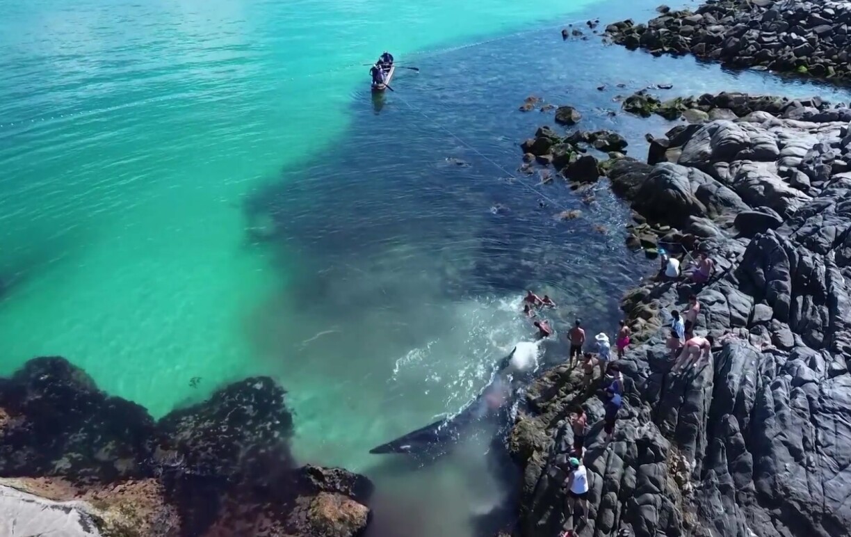 Alors que les pêcheurs dans le bateau lancent une ligne que les nageurs nouent autour de la queue de la baleine, celle-ci est lentement tirée vers l’arrière hors de la crique vers le large. Mais à quelques instants de sa liberté, il fait demi-tour et se précipite sur une autre partie de la côte rocheuse avant d’être malmené et entraîné dans des eaux plus profondes.