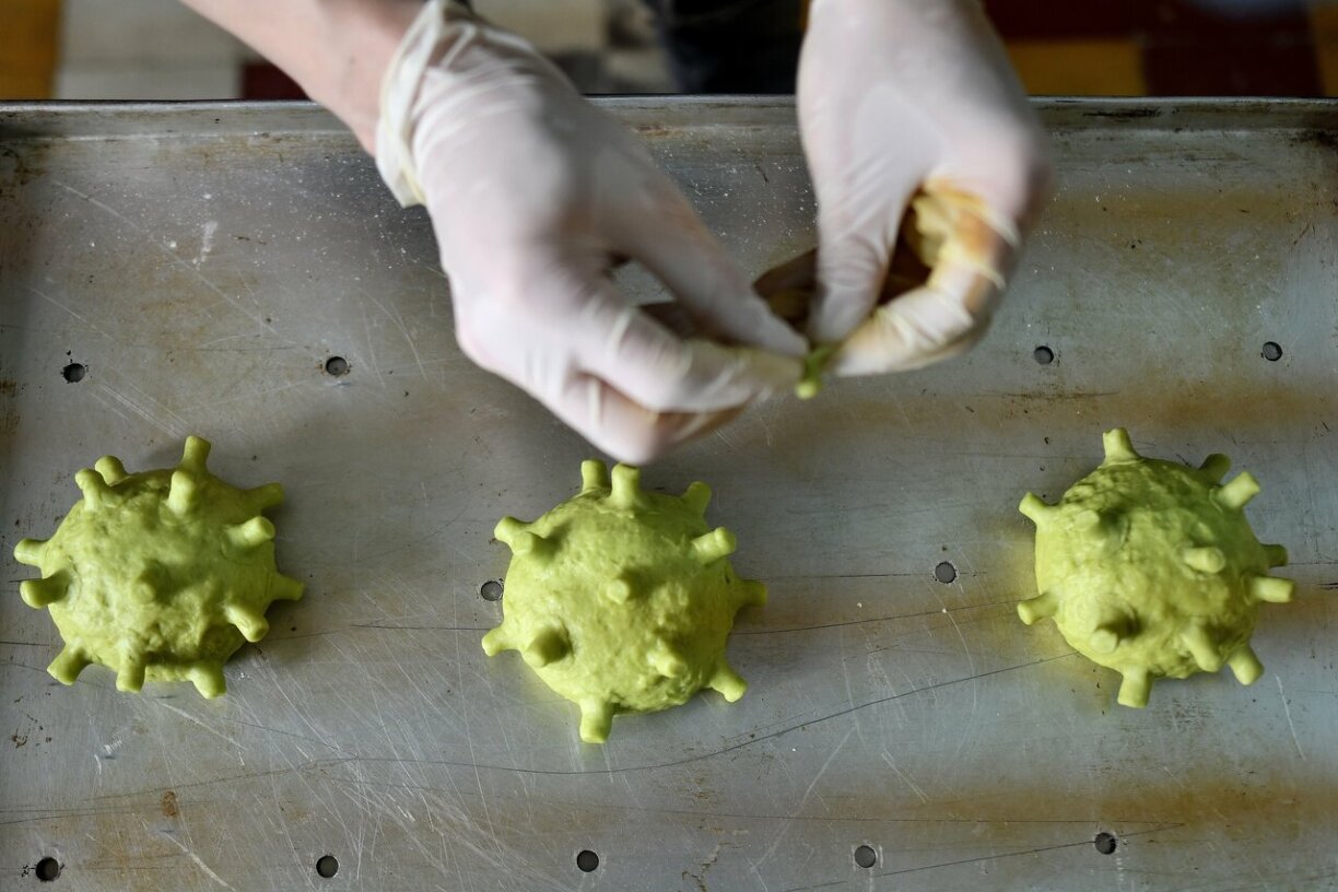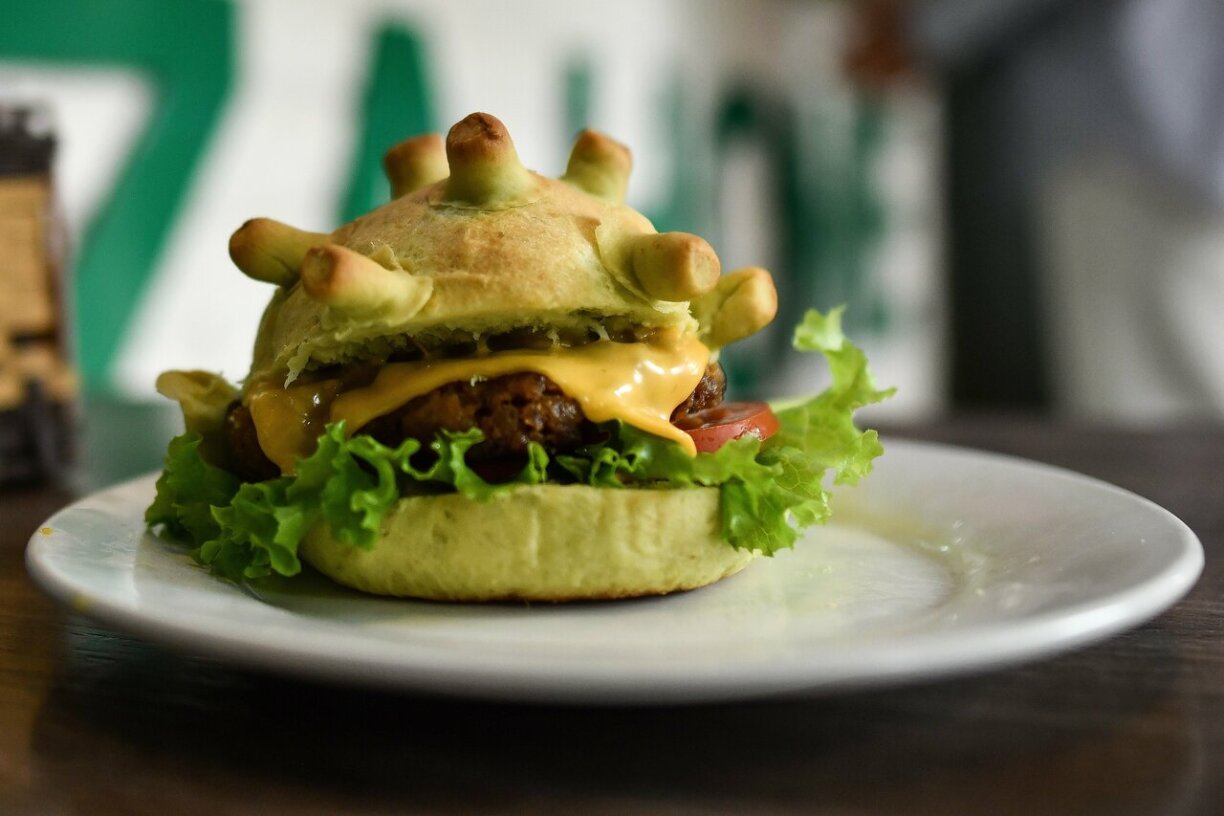 Ce n’est sans doute pas du meilleur goût, encore que je ne l’ai pas goûté...Une pizzeria vietnamienne sert un drôle de burger à la forme inspirée par le coronavirus. Le chef, Hoang Tung, espère que ses créations de brioches teintées de vert et de la forme caractéristique du Covid-19 feront sourire ses clients. “J’ai entendu tellement de choses négatives et tristes sur le coronavirus que j’ai pensé à faire quelque chose ... qui rende les gens heureux”